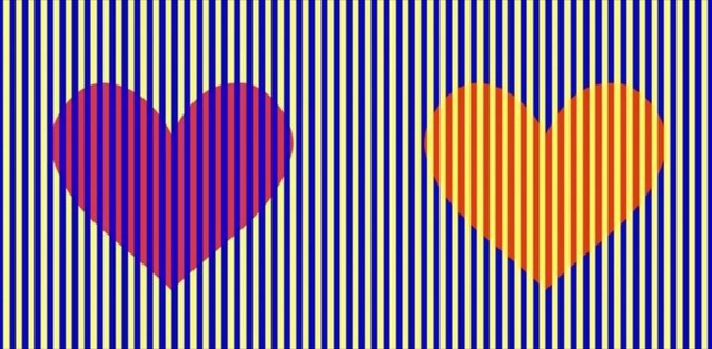 These 2 hearts are different colours, or are they?. Believe it or not, they are exactly the same colour. It’s the lines that pass through them which creates this affect.
