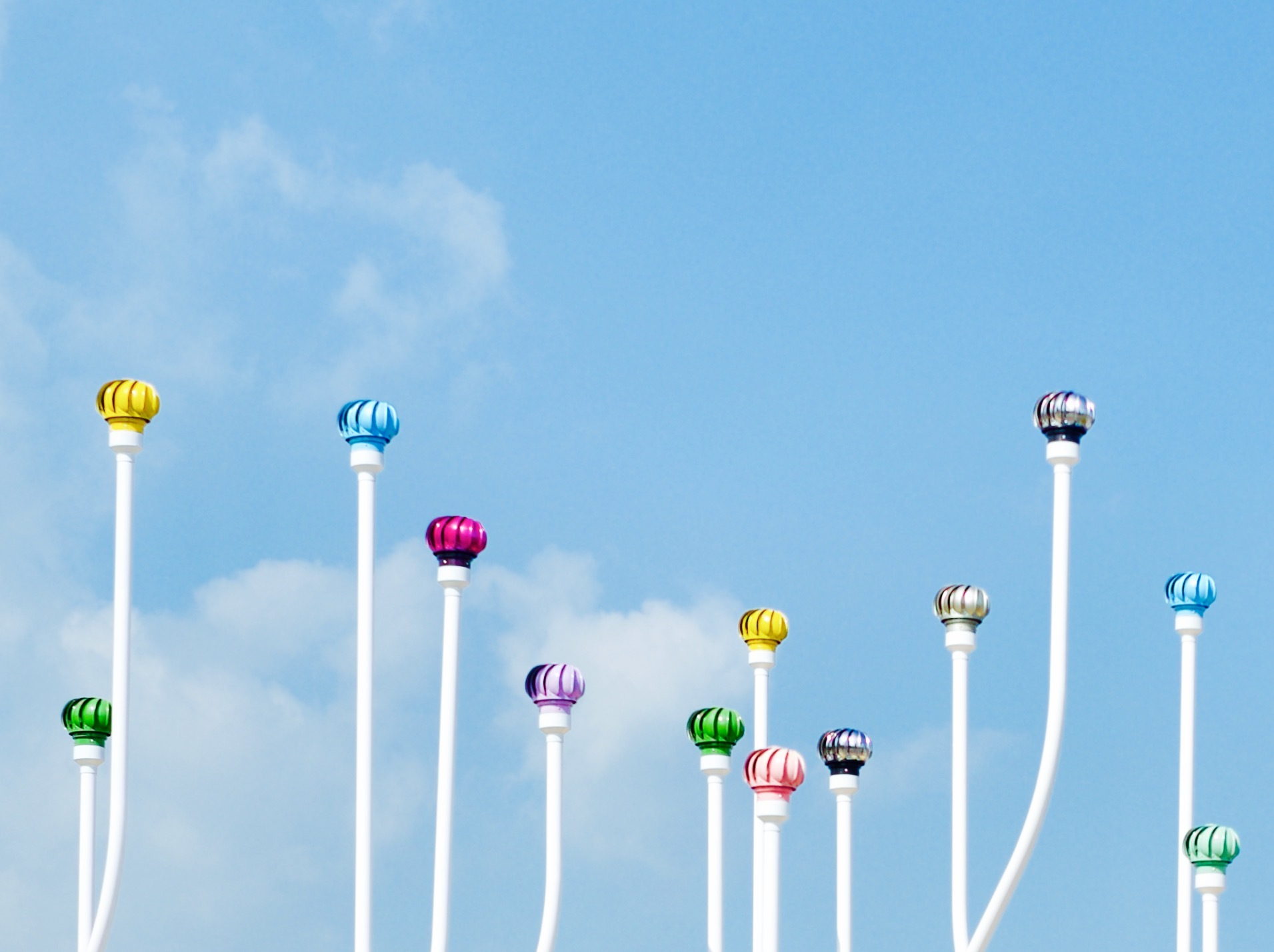 This artwork begins with a wind powered kinetic installation, combined with the special features of the city flower (azaleas), creating a landscape installation that allows viewers to be immersed inside the flower. The work is created mainly from bent circular pipes, in taller, shorter, positioned densely or sparse way, resulting in a dynamic visual sense. On the top of each pipe are different colored balls moving with the wind to create a rich appearance. As the site is located in the car park, several large and small platforms are created with North America cedar wood to soften the hard asphalt and attract passerby to pause and enjoy.