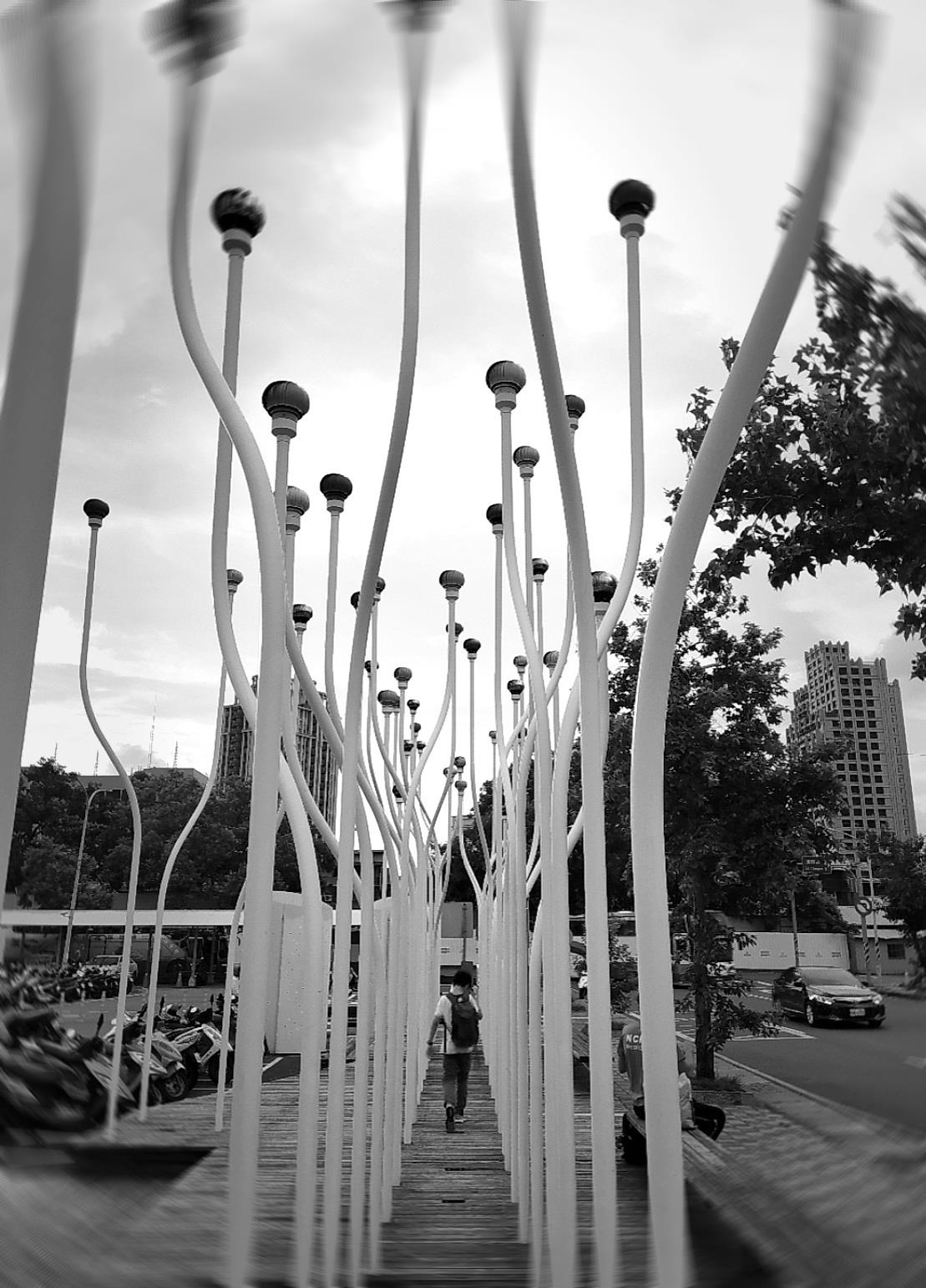 新竹素有『台灣矽谷』之稱,又擁有許多得天獨厚的 自然環境,其中最有名的便是『風』。本作品以風動 的裝置結合市花 ( 杜鵑花 ) 的特色,發展出讓人能置 身『花蕊』之中的地景裝置。彎曲的圓管有高有低、 有疏有密,形成極為動態的視覺感;每支彎管的頂端 則設有顏色不一的風動球,隨風轉動產出更豐富的樣 貌。由於基地場景位於停車場空間,為柔化現場的柏 油路鋪面,使用北美杉來創作出數個不同大小與尺度 的場景平台,吸引往來的人群在此停留與遊憩。
