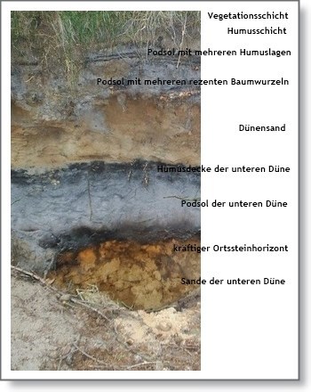 Gute Voraussetzungen für die Bildung finden sich aber auch auf den sandigen Böden wie hier in Joldelund. Hierbei wurde die Entwicklung von Podsolen durch den Menschen dahingehend gefördert, dass die natürlichen Eichen-Birken-Wälder gerodet und durch Nadelhölzer, welche saure Bodeneigenschaften hervorrufen, ersetzt wurden.