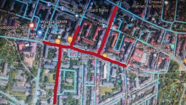 Na mapie poniżej ulice zostały zaznaczono czerwonym kolorem.