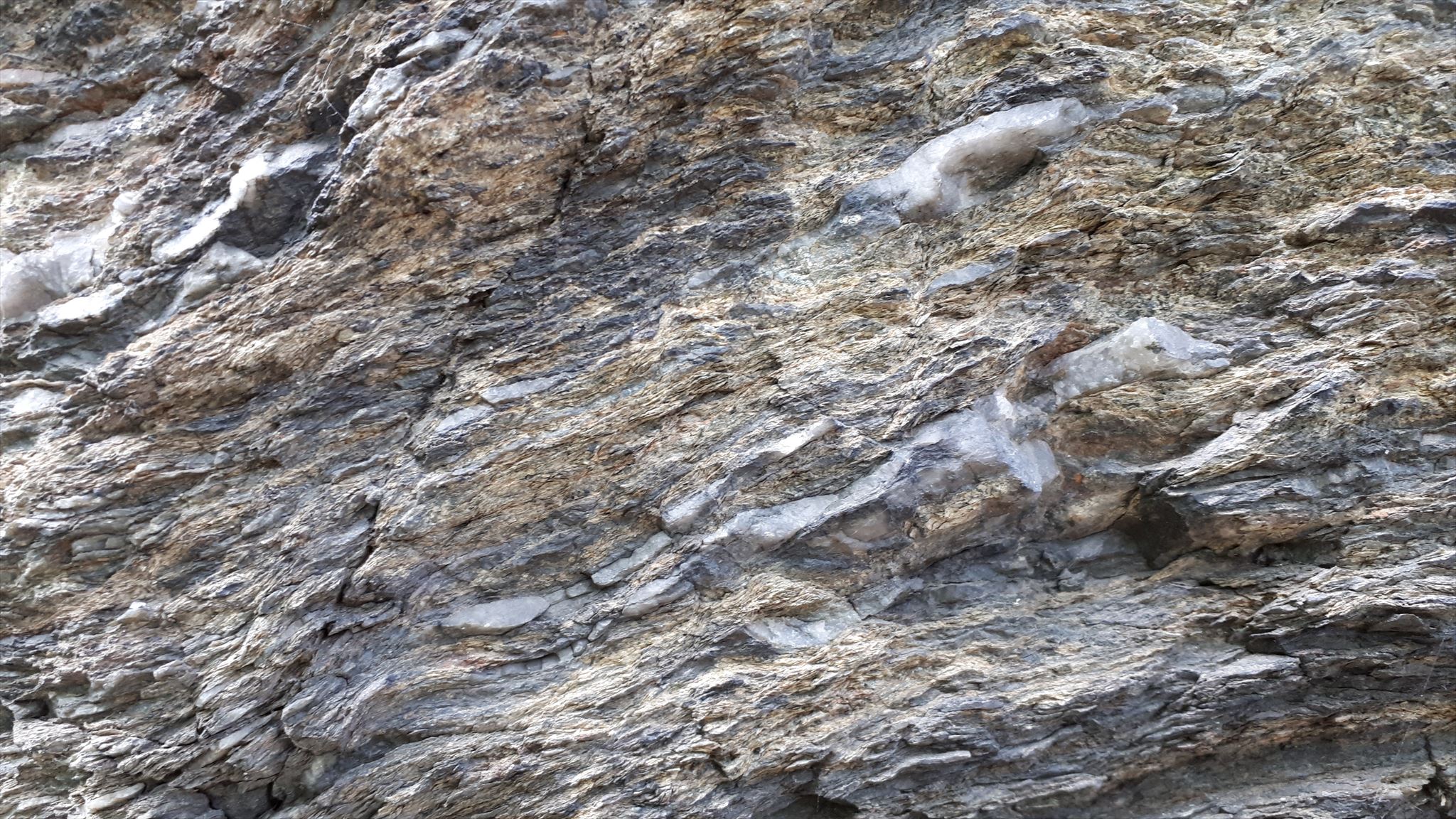 Die Schieferung kennzeichnen wir als ein Ergebnis von gerichtetem tektonischen Druck. Das heißt, Tonmineral- oder Glimmerblättchen richten sich durch Umorientierung oder gerichtetes Neuwachstum immer senkrecht zum Druck ein. Diese Schieferung oder Foliation ist also völlig losgelöst von älteren Flächengefügen wie z.B.Schichtung. In diesem Aufschluss lässt sich beweisen, das ein älteres Flächengefüge existierte, jedoch von der letzten Schieferung überprägt und fast ausgelöscht wurde. Fast, denn wir finden die Überreste der älteren Flächen in auffälligen Quarzlinsen, die bei intensiverer Betrachtung Faltenumbiegungen erkennen lassen - so genannte reliktische Faltenkerne.