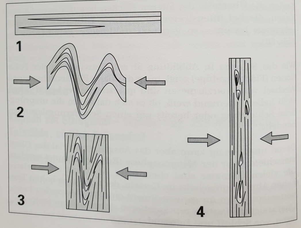 Wie das Schema in der Abbildung zur Entwicklung der Foliationen ( Flächengefüge) zeigt, muss die ältere Flächenschar einen Wechsel von quarzärmeren und quarzreicheren Lagen dargestellt haben. Niemand weiß, ob es sich dabei um die ursprüngliche Schichtung oder bereits um einen Schieferungslagenbau handelte.