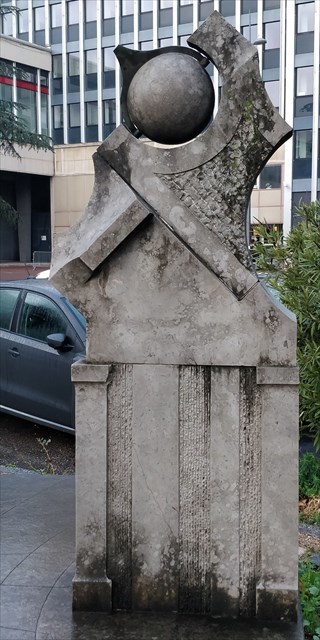 Le cadran a été inauguré en 1987. Une inscription gravée le rappelle au dos du cadran, derrière le support où est monté la sphère. E = n° du jour d'inauguration (entre 1 et 31) + n° du mois d'inauguration (entre 1 et 12)