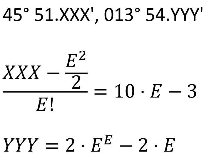 Stojite pri mostu čez potok Belo. Poiščite pozitivno celoštevilsko rešitev enačbe, ki se nahaja na ograji neposredno pod železno kroglo premera 10 cm. To število naj bo E.