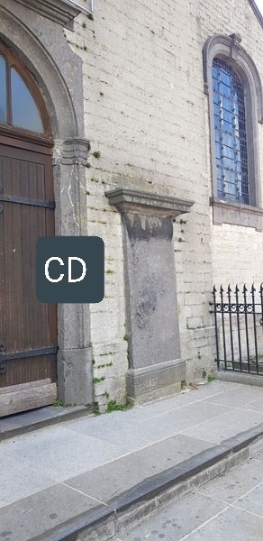 Sur la façade de l'église, vous voyez deux dalles tumulaires aux inscriptions quasi illisibles. Les trois premières lettres sont lisibles et identiques sur chaque dalle.