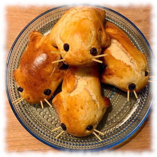 J - Nun aus dem Eigelb und dem Esslöffel Milch einen Guss anrühren und die Robben damit bestreichen. Jetzt noch zwei Rosinen als Augen in den Teig drücken.