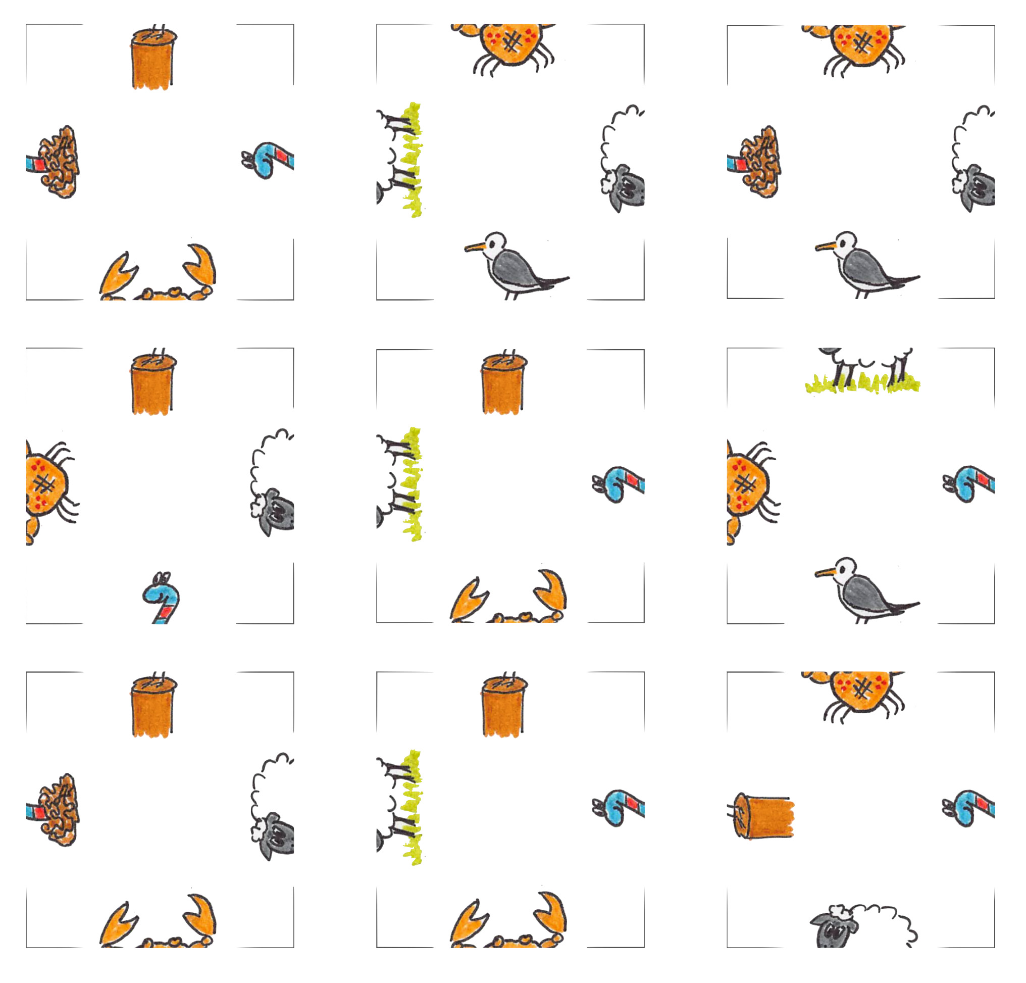 Um an die Koordinaten für diesen Cache zu kommen, müsst ihr das Puzzle lösen. Schneidet dafür die Quadrate aus und legt sie zu einem großen Quadrat zusammen (3x3 Teile). Und zwar genauso, dass die Tiere in der Mitte richtig zusammengesetzt sind. Es wäre also falsch, zwei Köpfe gegeneinander zulegen, oder die Schafsbeine mit den Krebszangen zu kombinieren.