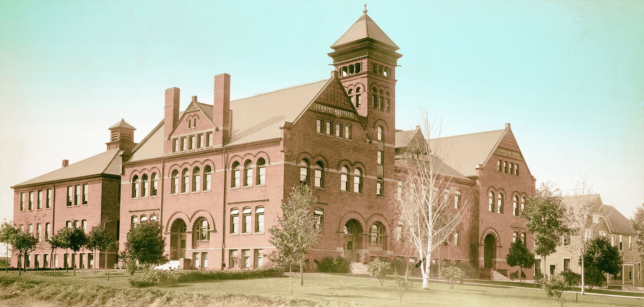 In 1894 The Ferris Industrial School changed location from the corner of Michigan Avenue and Maple Street (in the Big Rapids Northern National Bank Building) to the corner of Oak Street and Ives Avenue (where the Prakken Building is now). The first building, known informally as "Old Main," stood on a slight rise of ground facing north. It was constructed of red brick and roofed with Vermont purple slate laid in fancy patterns. Mr. Ferris said that no special effort had been made to construct a showy building, and the style of architecture was in good taste.