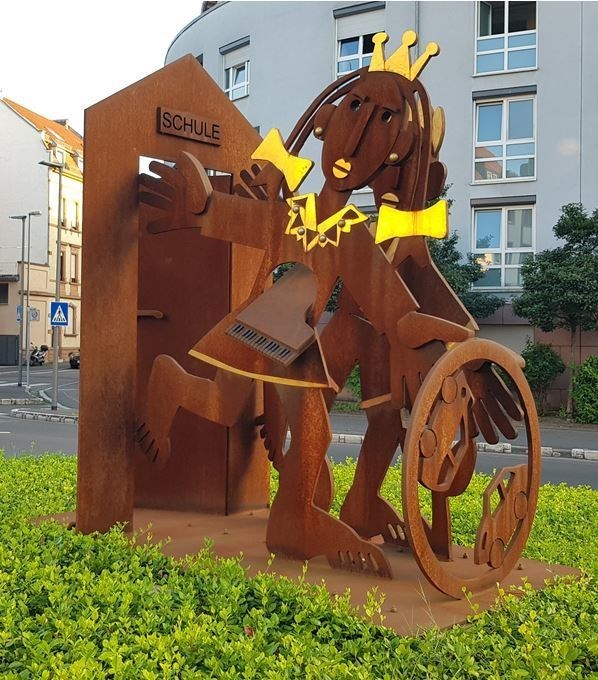 Die Skulptur "Spielende Prinzessin" wurde nach den Entwürfen des Künstlers Wolfgang Aulbach von der Firma Faust Metalltechnik GmbH, Laufach, aus Cortenstahl mit Buntmetall-Applikation angefertigt.