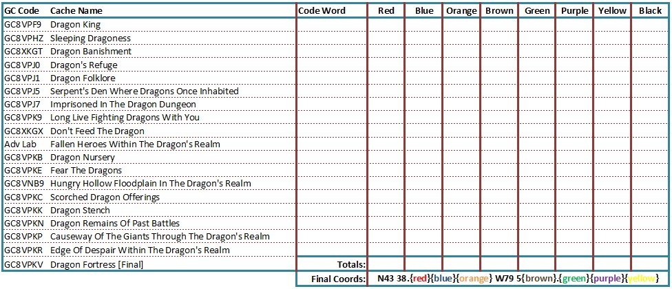 About the Dragon's Realm series This series consists of 19 geocaches. In order to find the final treasure located at the Dragon Fortress, you will need to journey through the far reaches of the Dragon's Realm to locate 18 treasures each containing a code word (18 in total). You can complete these 18 journeys in any order, however many adventurers will go from the west to the east as it is wise to seek the blessing of the Dragon King upon entering the Realm. As you complete each journey and discover the code word, you can enter the code into its respective Certitude checker (see Geocaches in the Dragon's Realm series section below). Take note of how many dragons of each colour appear when you enter each code word. The treasure at the Dragon's Fortress can be found by entering the total counts of each coloured dragon into the following: N43 38.{red}{blue}{orange} W79 5{brown}.{green}{purple}{yellow}You can use the Dragon's Realm Work Sheet to keep track of the code words and coloured dragons that you encounter. **All information related to this series can be found on this cache page.