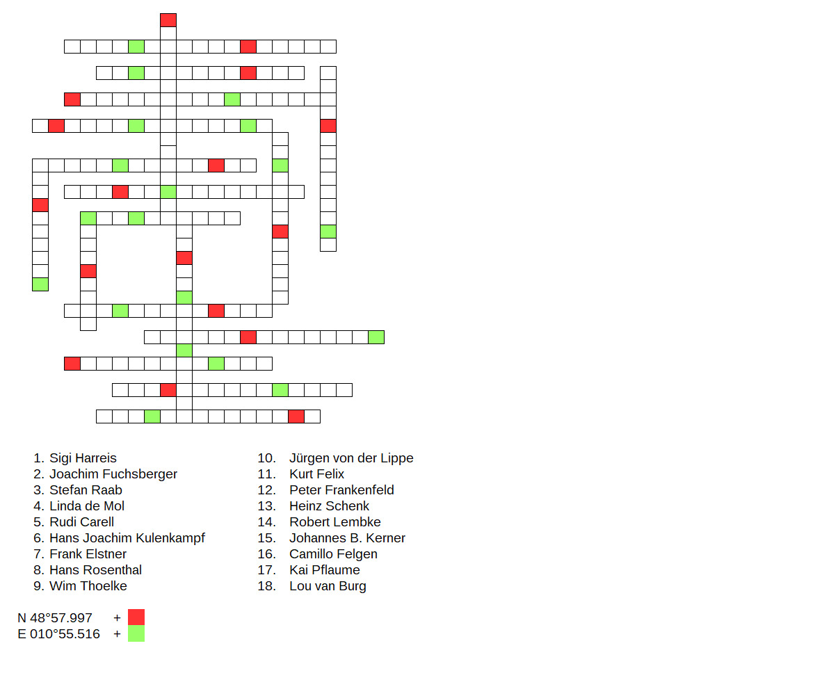in die Gitternetze eintragen. Bei diesen Cache geht es um Deutsche Fernsehunterhaltung Shows Quiz die noch zu sehen sind aber auch Klassiker