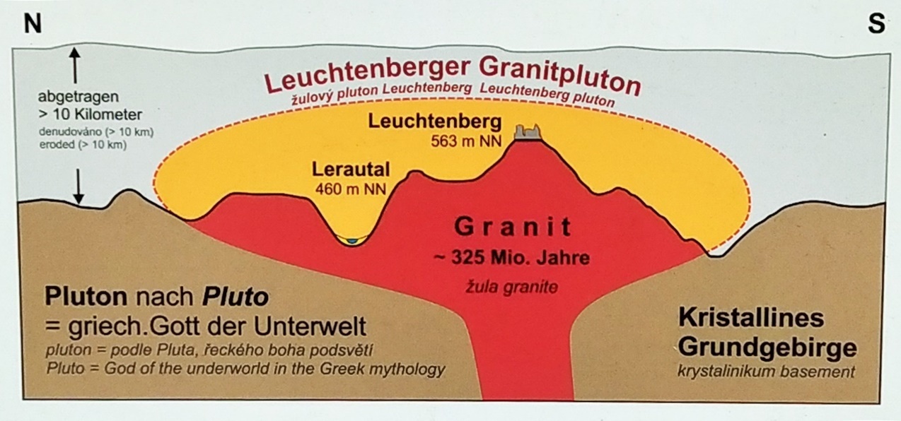Die spätvariskischen Granite aus dem Zeitalter von 280 Millionen Jahren sind in der nördlichen Oberpfalz mit einer Fäche von ca.40x12 km weit verbreitet. Das Granitmassiv von Leuchtenberg nimmt dabei eine -im wörtlichen Sinne- herausragende Stellung ein. Eingebettet in den Gneisen der "Neustäder Scholle", auch ZEV genannt ("Zone Erbendorf-Vohenstrauß") bildet der Granit sanfte Kuppen und besonders malerische Bach- und Flußtäler, oft mit Blockkmeer-Bildungen und Wollsack-Verwitterung. Südlichster Vertreter dieser Granitbildungen ist in der nördlichen Oberpfalz der Höhenrücken von Leuchtenberg, der die Burg und den gleichnamigen Ort trägt. Nur wenig südlich Leuchtenberg grenzt die Luhe-Linie, eine tektonische Störung, einen geologisch deutlich anderen Bereich ab. Zwar finden wir vielfach auch jenseits dieser Störung Granit, dieser weist aber eine andere Struktur, Alter und Färbung (gerne rötlich, wie z.B. der frühvariskische Granit im Wölsendorfer Flußspatrevier) auf.