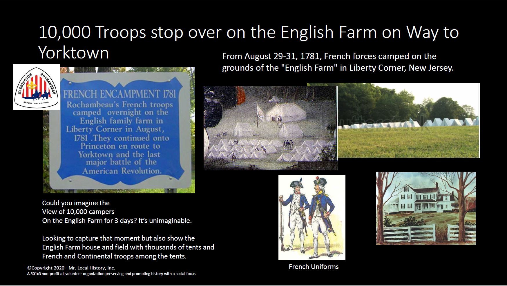 The tiny village of Liberty Corner known in 1791 as “Bullion’s Tavern,” was a stopover point for French Gen. Jean Baptiste Donatien de Vimeur, le Comte de Rochambeau and his 5,300 troops during the 1781 march from Providence, R.I., to Yorktown, Va. On August 29/30, 1781 French forces camped at Bullion’s Tavern on the grounds of what is today called the “English Farm”, their twenty-second camp since departure from their first camp in Providence, Rhode Island, on June 18, 1781.