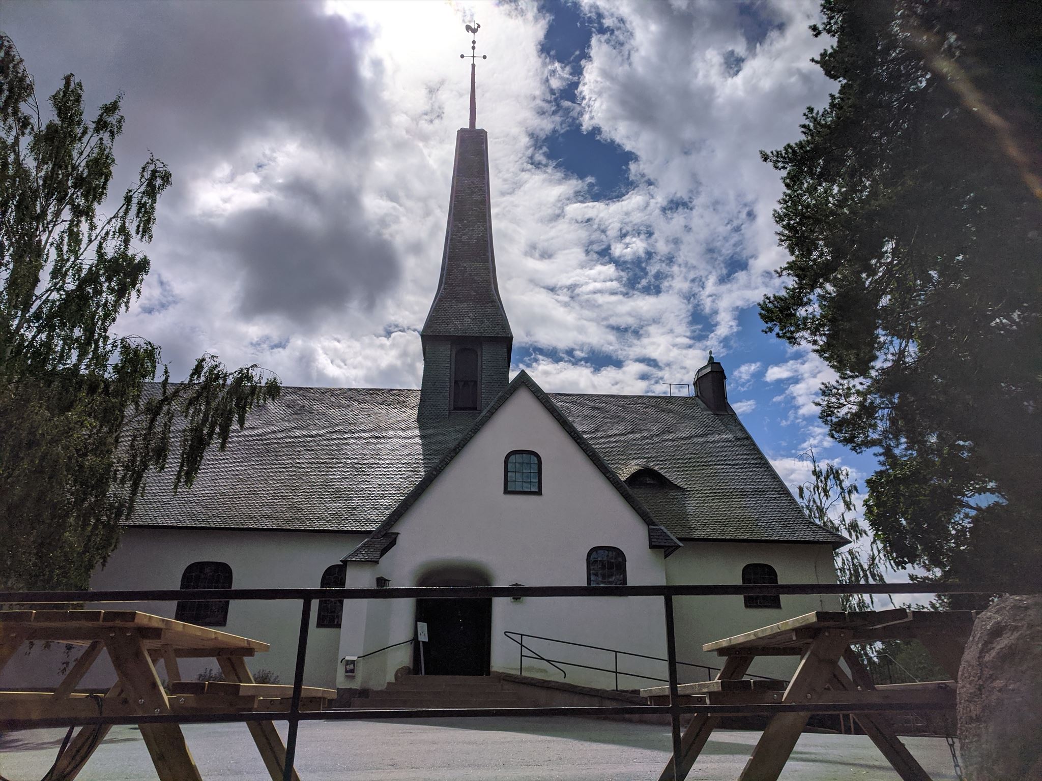 Kyrkan vilar på en sockel av råhuggen granit.