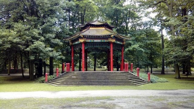 Jednak wbrew opisom ze wspomnianych keszy, altana nie pochodzi z XIX wieku. Nie ma jej na żadnym planie, który przedstawia park przedwojenny. Co prawda nie dotarłem jeszcze do roku powstania tej konstrukcji, ale źródła zgodnie twierdzą, że jest to dodatek bardziej współczesny. W swoich wspomnieniach spisywanych w latach 1986-1993 Władysław Kościelniak mówi o „ostatnio” wybudowanej chińskiej altanie, więc daje to pewien pogląd na sprawę. Obiekt wyremontowano w 2007 roku.