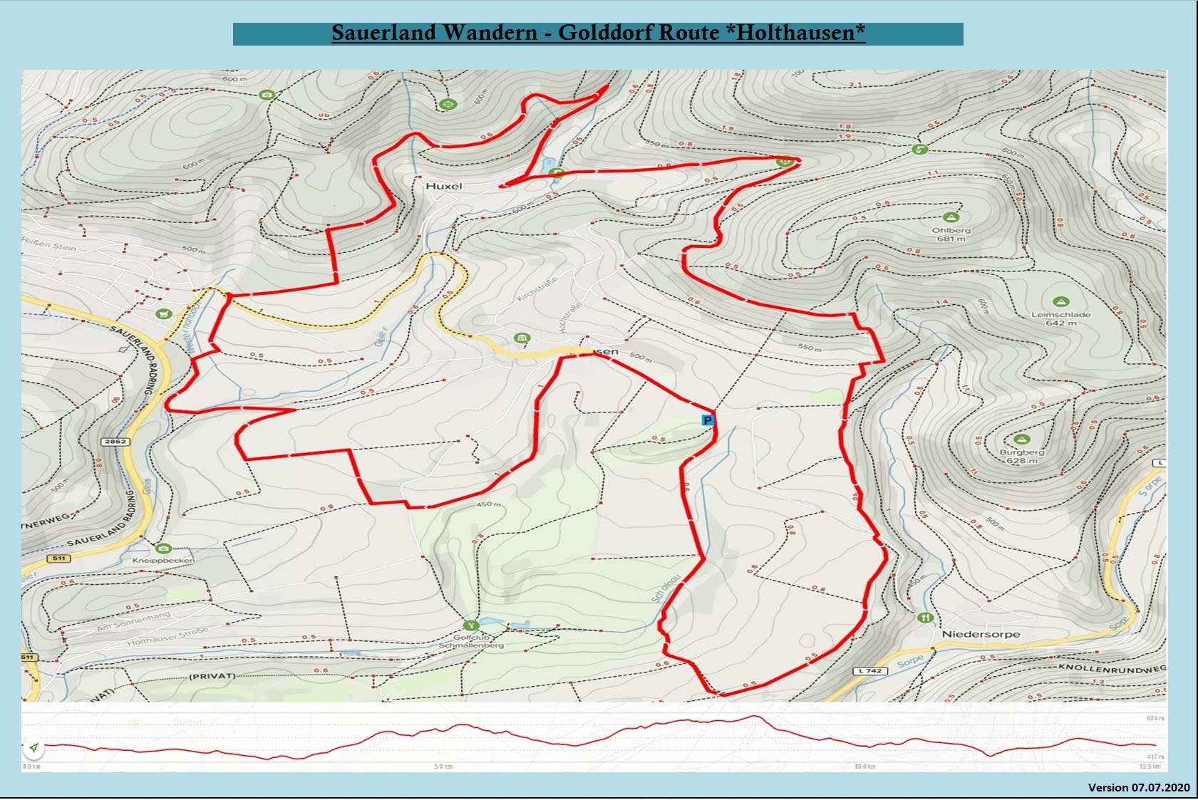 Wir starten am Wanderparkplatz Lüttmecke und laufen erstmal am Golfplatz vorbei in Richtung Napoleon Baum. Dies ist einer von zwei schweren Anstiegen auf der Tour. Danach kommt noch ein schwerer Anstieg am alten Sportplatz. Man wird danach aber mit einem traumhaften Weg und grandioser Aussicht belohnt. Hier gibt es ausreichend Bänke zum Verweilen und kurz verschnaufen. Danach sind die Höhenmeter gut verteilt und leicht zu bewältigen. Die Wege führen teilweise über den Sauerländer Höhenflug. Genauso führt die Route über ein Teil der Goldroute von Niedersorpe. Hier bitte unbedingt auf den Zusatz "Holthausen" achten.
