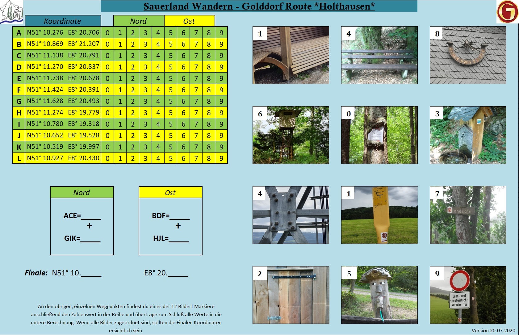 Um das Finale zu finden müssen 12 Bilder einzelnen Buchstaben zugeordnet werden. Die Zahl aus dem zugeordneten Bild wird in eine Tabelle unter der Koordinaten Reihe markiert. Am Ende, wenn alle Bilder gefunden sind, ist die Finalkoordinate ersichtlich.