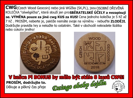 [ENGLISH]CWG (Czech Wood Geocoin) or other WGs (SK,PL,NL) are personal wood circles, which are used as a collectable item for its owners and don’t log to the geocaching website. There is a rule for its changing – You may only EXCHANGE PIECE FOR PIECE. Please follow the rules and don't ruin the game for others. Thanks. There should be always 8 pieces in the box. We are very curious how long it will take. We shall see:o)
