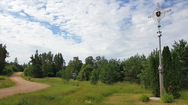 Čia, kažkur tarp Dusmenų ir Dusmenėlių, kažkur vidur keturių ažariukų, žvyrkelio sankryžoj stovi sau kryžius metalinis. Pastatė jį 1990 metais Juozas Stadalnykas tokis. Tai ne šiaip sau kryžius - interesnas toks, visas kitoks. Juo groti galima kaip su skudučiais! :) Da tep nematis niekur! Atvažuok, pamacyk pats, ir da lobį rask! Ir taip, dar pro šią vietą vingiuoja Camino Lituano maršrutas.