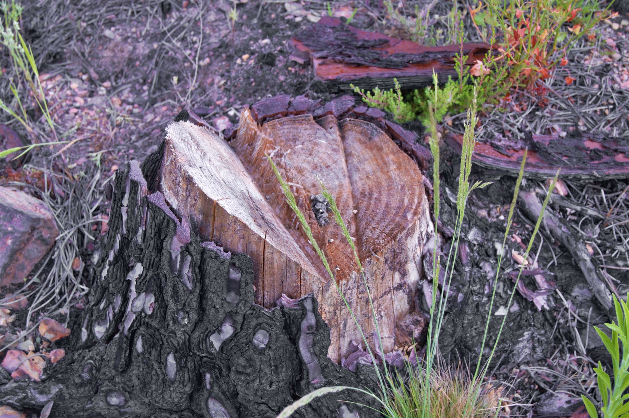 Na toiça de um pinheiro monumental que sucumbiu à força das chamas, descansa a ferramenta do lenhador, que arduamente honrou o trabalho na floresta.