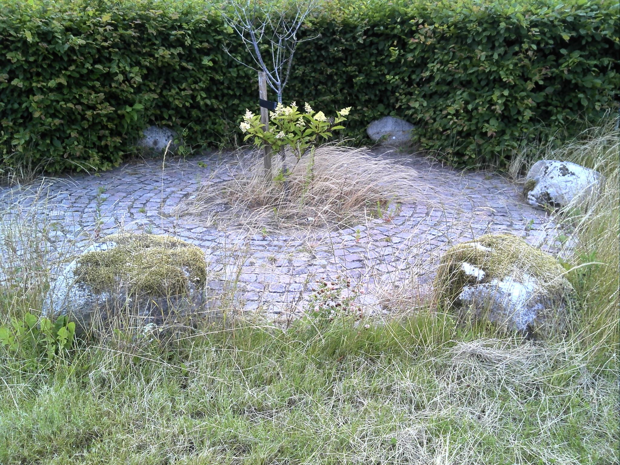 Når du står med ryggen til stedet, findes der en lille plet med en ring af brosted, hvori der er et lille træ plantet i midten, ca 1,5 meter + en stor håndfuld af de løse centimeter