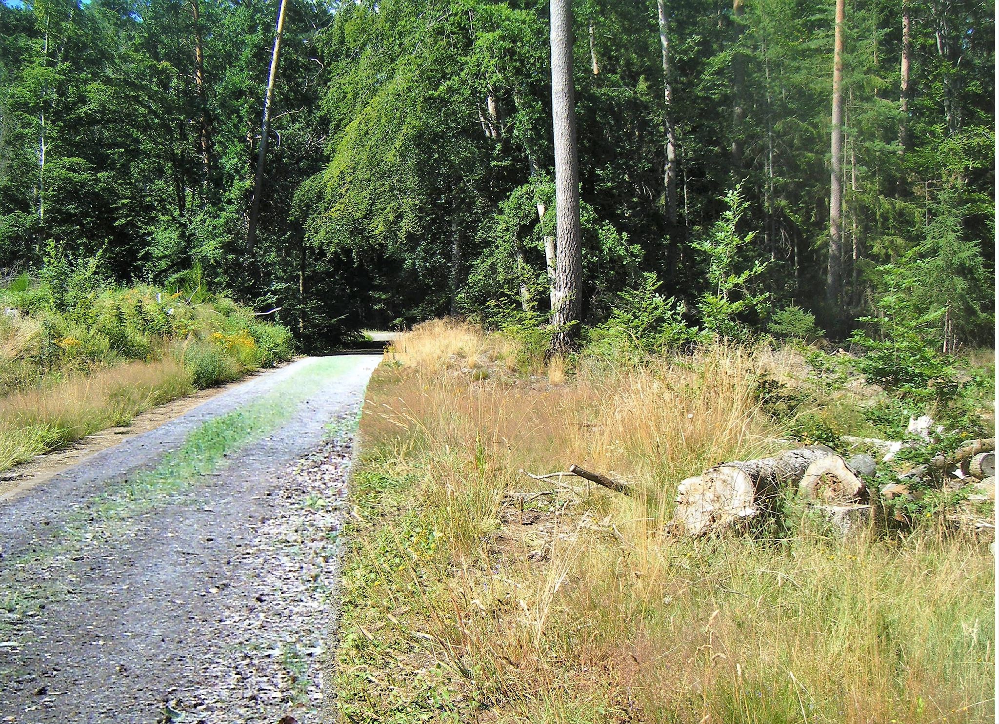 - Baumstämme, die neben den Wegen gestapelt sind und jederzeit abgeholt werden können.