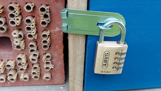 Im neuen Insektenhotel befindet sich nun auch ein Platz für TravelBugs hinter einem Schloss.