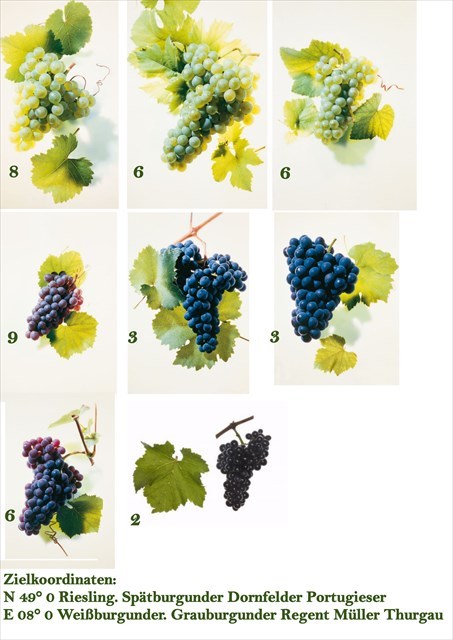 Ermittle die Koordinaten des Finales aus dem Plan mit den Rebsorten. Jeder Rebsorte ist eine Ziffer zugeordnet.