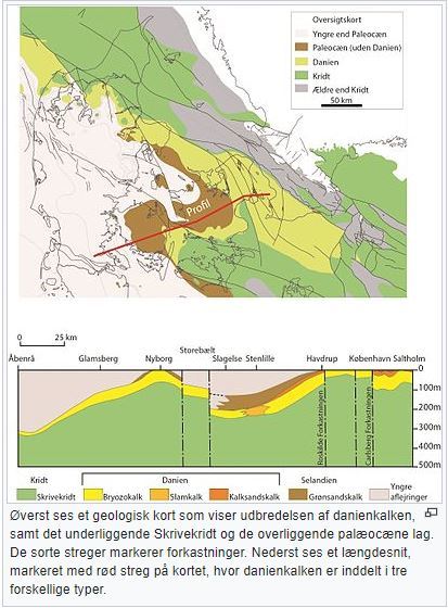 Through the Danien-Age Denmark was covered by a hot subtropical ocean at depths reaching from 100-150 m. Due to the continents moving it was located at the same latitude as Switzerland, but as the global temperature was higher than today, the subtropical climate zone has reached further north than today.