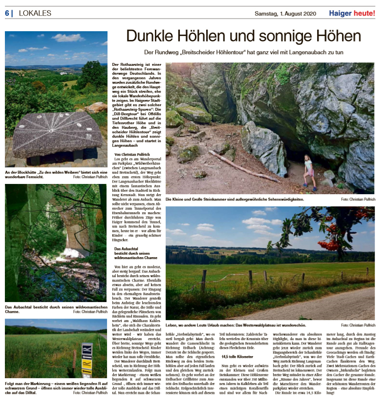 Es gibt eine sehr schöne Wanderung, bei der man am Cache vorbeikommt: Die "Breitscheider Höhentour", die ich im Haigerer Mitteilungsblatt "HAIGER HEUTE" reportiert habe: