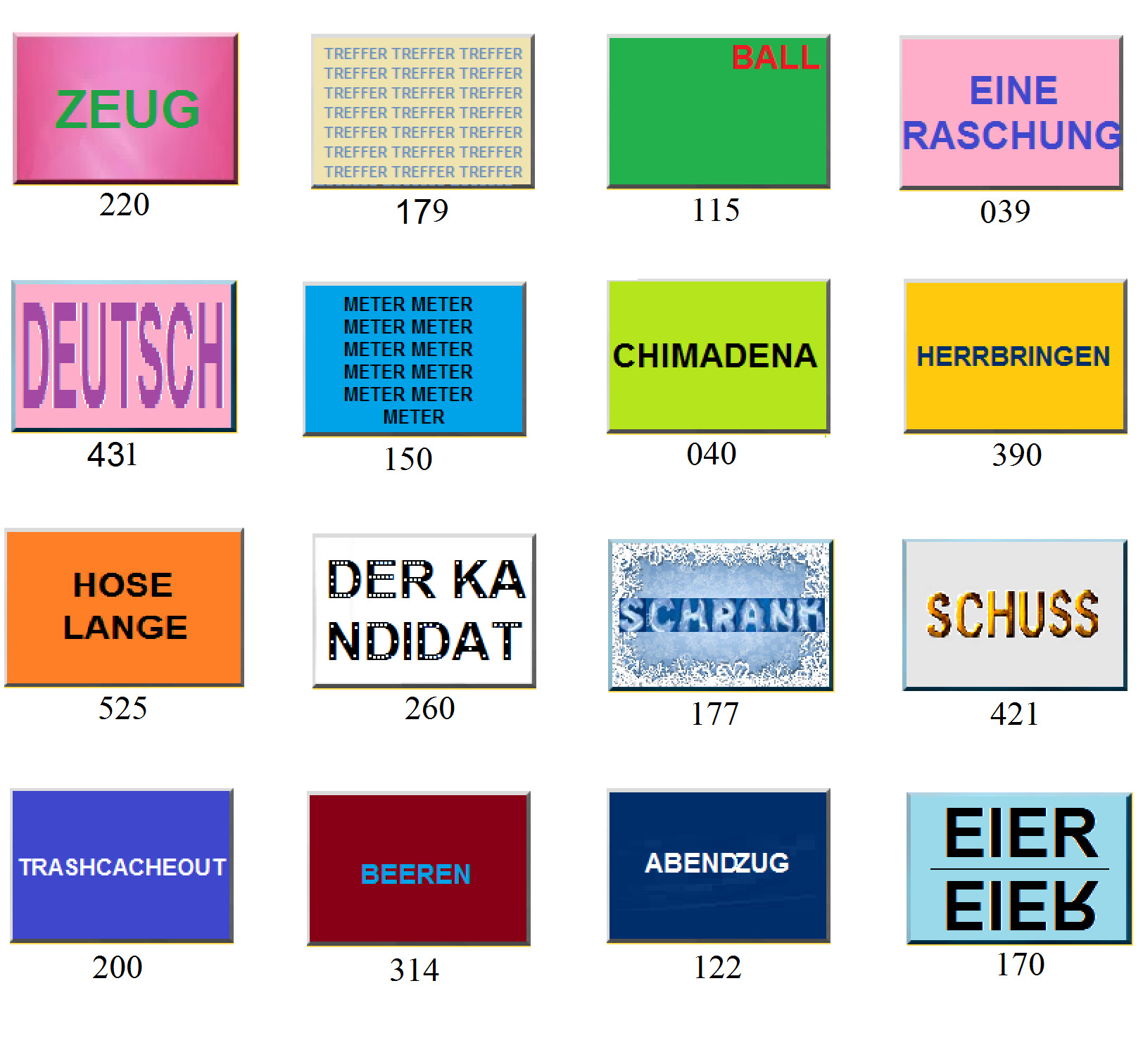 Jeder der sechzehn Begriffe hat sein passendes Bildchen und jedes Bildchen sein Begriff.