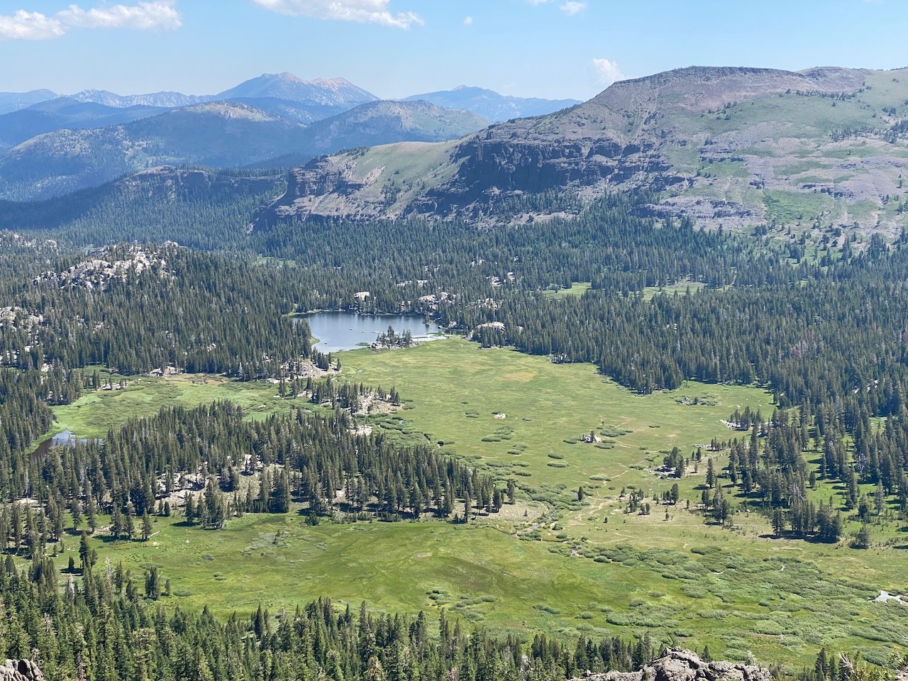 Although this trail has no formal name as far as I can tell (I have dubbed it "Carson-Showers Ridge Trail"), it is one of the most spectacular in the region. It starts at the top of the Pacific Crest Trail above Carson Pass (see geocache Pacific Crest Trail: Top of Carson Pass), then traverses the ridge line all the way to Showers Lake (see geocache Showers Lake). Along the way it offers almost uninterrupted heart-stopping views, both of the Carson Pass / Round Top skyline, and also of the Upper Truckee Meadow, including Meiss Lake, Round Lake and even Four Lakes.