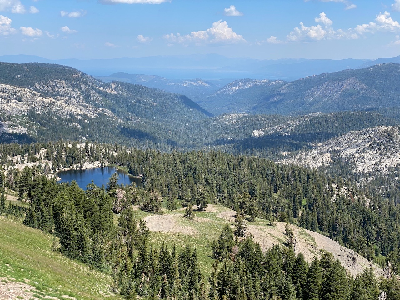 Although this trail has no formal name as far as I can tell (I have dubbed it "Carson-Showers Ridge Trail"), it is one of the most spectacular in the region. It starts at the top of the Pacific Crest Trail above Carson Pass (see geocache Pacific Crest Trail: Top of Carson Pass), then traverses the ridge line all the way to Showers Lake (see geocache Showers Lake). Along the way it offers almost uninterrupted heart-stopping views, both of the Carson Pass / Round Top skyline, and also of the Upper Truckee Meadow, including Meiss Lake, Round Lake and even Four Lakes.