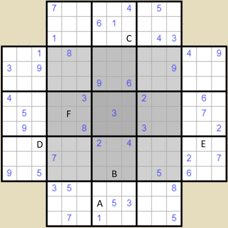 ➊ 5 normale 9x9 Sudoku Diagramme sind so miteinander verwoben, dass keines für sich gelöst werden kann, alle 5 Diagramme zusammengenommen aber eine eindeutige Lösung haben.