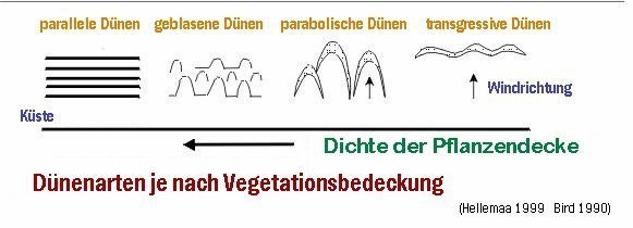 Die Vegetation hat einen großen Einfluss auf die Dünenarten. Wenn es eine Menge Dünenvegetation gibt, bilden sich s ymmetrische, parallele Dünenstreifen. Bei einer kleineren Pflanzendecke bilden sich "Blasen", Parabeldünen und Wanderdünen. Wenn die Vegetation sehr schwach ist, können seltene transgressive Dünen gebildet werden. Sie entstehen durch menschliche Aktivitäten - das Fällen von Bäumen und Sträuchern führte zur Stabilisierung bestehender Dünen und zur Winderosion.