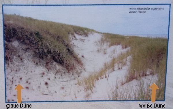 Der weiterhin vom Wind ins Landesinnere getragene Sand bildet hinter der Primärdüne einen anderen Sandwall, der bereits eine haltbarere Schöpfung ist. Es ist eine weiße Düne, auch die vordere Düne genannt. Sie ist leicht, schwach bewachsen. Manchmal ist die weiße Düne direkt neben dem Strand und bildet eine niedrige Klippe. Dann bildet sich ein weiterer Dünenwall, der weiter vom Meer entfernt ist, windgeschützt, mit Gräsern, Zwergsträuchern und kleinen Sträuchern bewachsen. Der Sand ist grau, daher der Name der Düne - die Graudüne.