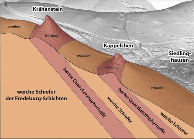 Nach Beendigung der variszischen Orogenese kam es in der Folgezeit zu witterungsbedingten Alterationsprozessen der Gesteine, wodurch das Gebirge wieder recht schnell abgetragen und schließlich eingeebnet wurde. Dabei wurden die weicheren Schiefer schneller erodiert als das härtere vulkanische Gestein. Begünstigt durch junge/rezente Hebungsprozesse, die am Ende des Tertiärs/im Quartär einsetzten, schnitten sich die Flüsse allmählich in die Rumpffläche des variszischen Gebirges ein und präparierten so im Laufe der Zeit die beiden härteren Quarzkeratophyrtuffit-Züge des Krähensteins und Käppelchens, eingebettet in den weicheren Tonschiefer der Fredeburg-Schichten, heraus.