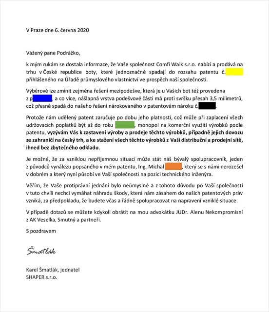 DISCLAIMER: Listing této kešky někdy pracuje se skutečnými údaji, protože se bez nich vyhledávání v rejstříku neobejde, tak například opravdu existuje společnost SHAPER, která vlastní patent na boty. Ale chci věřit, že její jednatel nikdy nemusel řešit zneužití obchodního tajemství, Ing. Michal je jistě čistý jako padlý sníh a pan Podrážka nikdy nejednal za firmu Comfi Walk. A že se celá smyšlená věc obešla bez smyšlených nekompromisních právníků.
