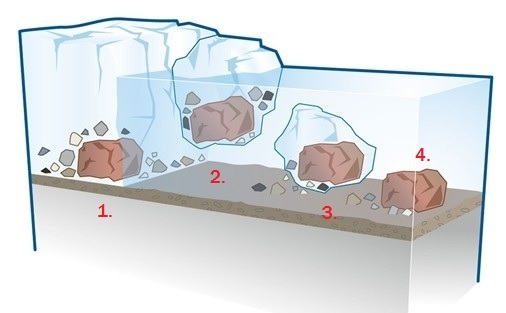 2. Et stykke av innlandsisen løsner og steinblokken transporteres med isens bevegelse.