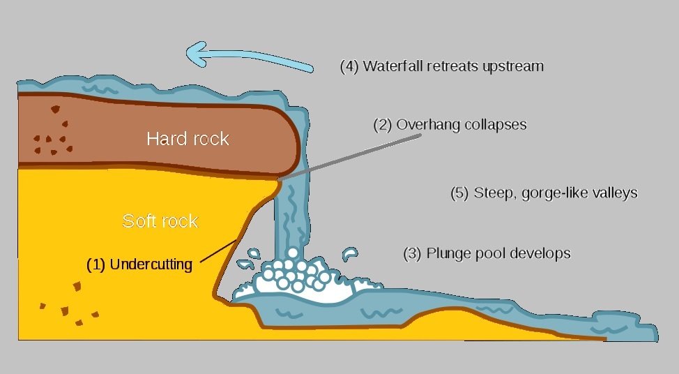 Vanligvis faller fossen som strømmer fra mykt berg til hardt berg. Dette fører til erosjon både langs bakken og der fossen treffer. I begge tilfeller eroderer den myke steinen, og etterlater en hard overflate der vannet beveger seg. Slik som dette: