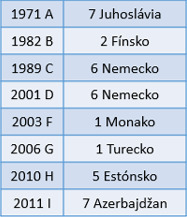 Priraďte k rokom krajinu, ktorá vtedy vyhrala a zároveň sa vám priradí číslo k písmenku.