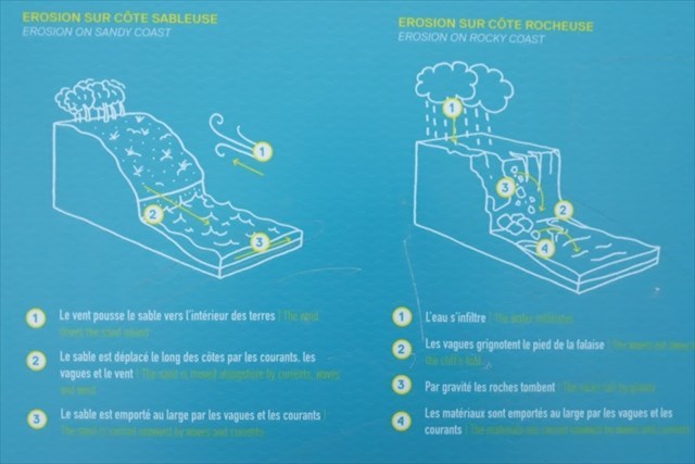Coastal erosion is a natural process caused by a variety of factors: wind, waves, runoff waters ... These meteorological processes cause the loss of materials (sand / rocks) and landslides leading to shoreline retreat (ocean-continent limit) further inland.