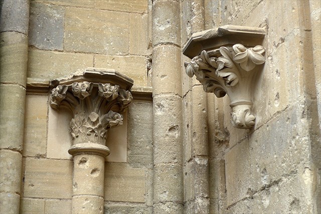 On observe également un calcaire moins gris, sans litage oblique visible. Ce calcaire présente les caractéristiques de la pierre de Caen. Son grain fin et son homogénéité lui confère les qualités requises pour réaliser de fines sculptures.