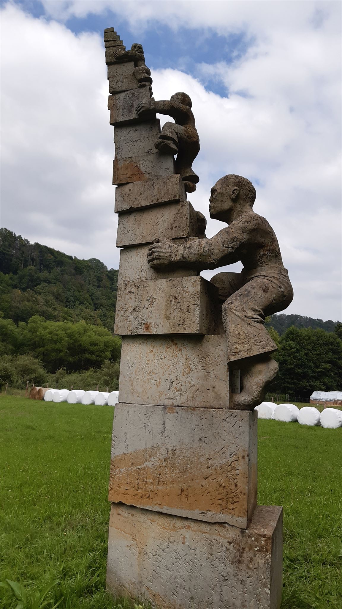 Stage 2: Skulptura "Ti před námi". Na spodním kvádru jsou vyryta písmena a číslice. Počet písmen = C. Číslice = D