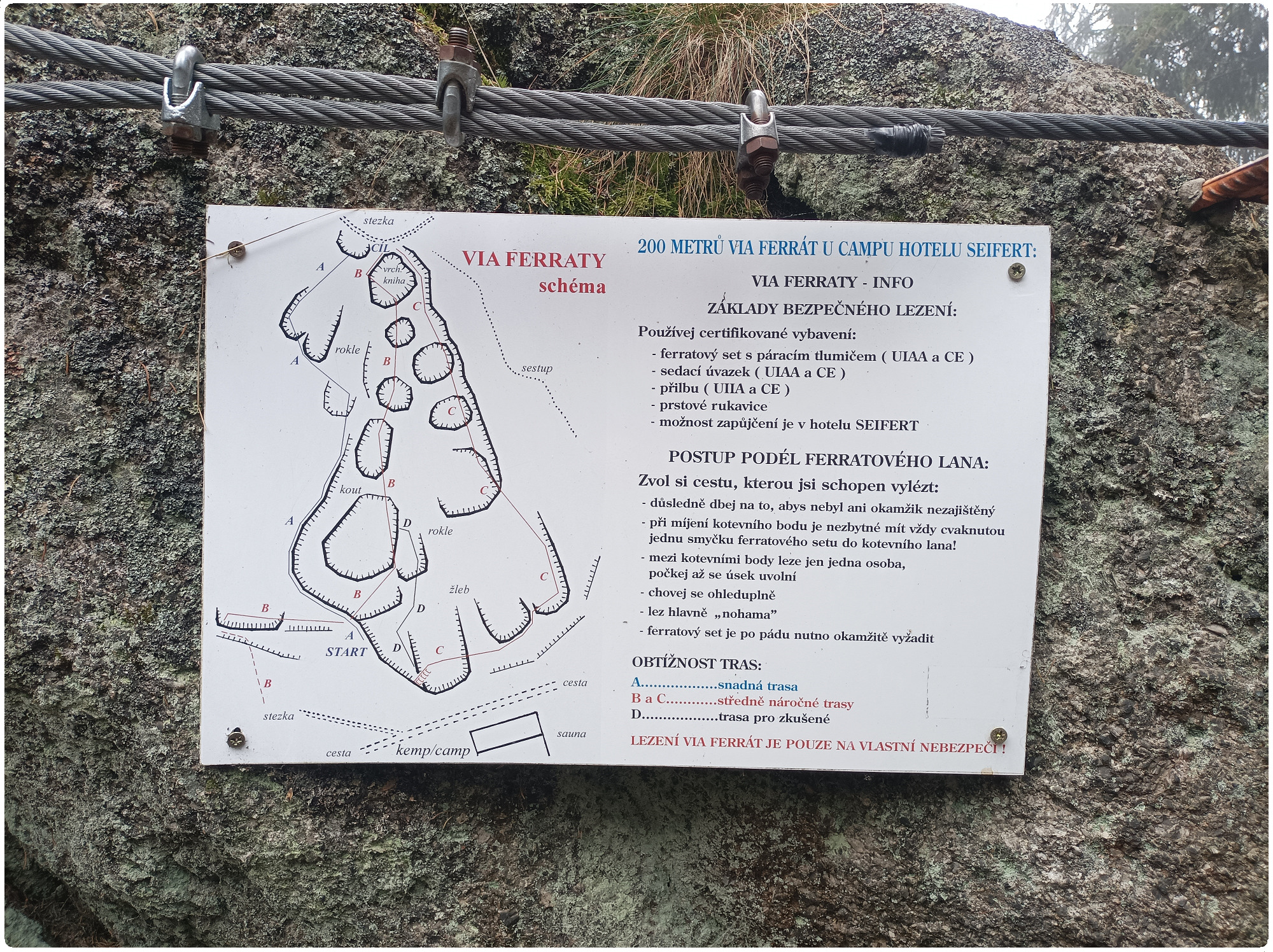 Za kopečkem pak scházíte pohodlně kolem skalek pěšinkou. Poslední z cest klasifikovaná, jako A/B je umístěná na nástupu zleva a je vhodná i pro začátečníky, nebo větší děti. Můj 8 letý syn by jí zvládl taky, ale ocelové lano je někde moc vysoko na to, aby na něj 120 cm člobrda dosáhnul. Puberťáci si na ní ale mohou klidně procvičit první krůčky a příjemně se zabavit. Suma sumárum Seifertova ferrata v Nových Hamrech se určitě nemůže rovnat cestám typu Pastýřská stěna v Děčíně , nebo Vodní brána u Semil. Poskytuje však dostatek prostoru pro trénink na těžší cesty a je navíc kousek od zahrádky hotelu Seifert, ze které na ní dohlédnete. Na chodbě restaurace navíc visí vždy pár sedáků a ferratových brzd, které vám tady za pár korun půjčí.