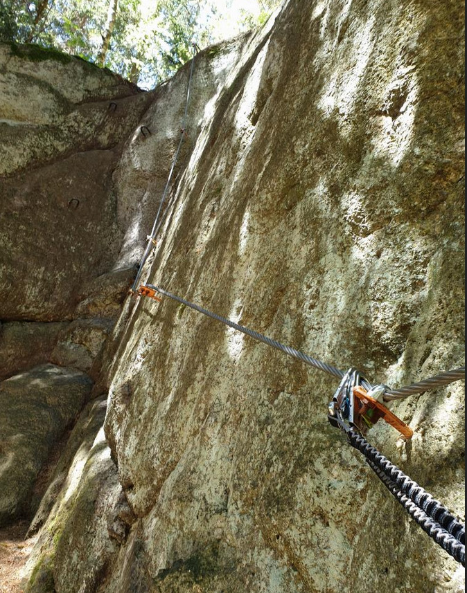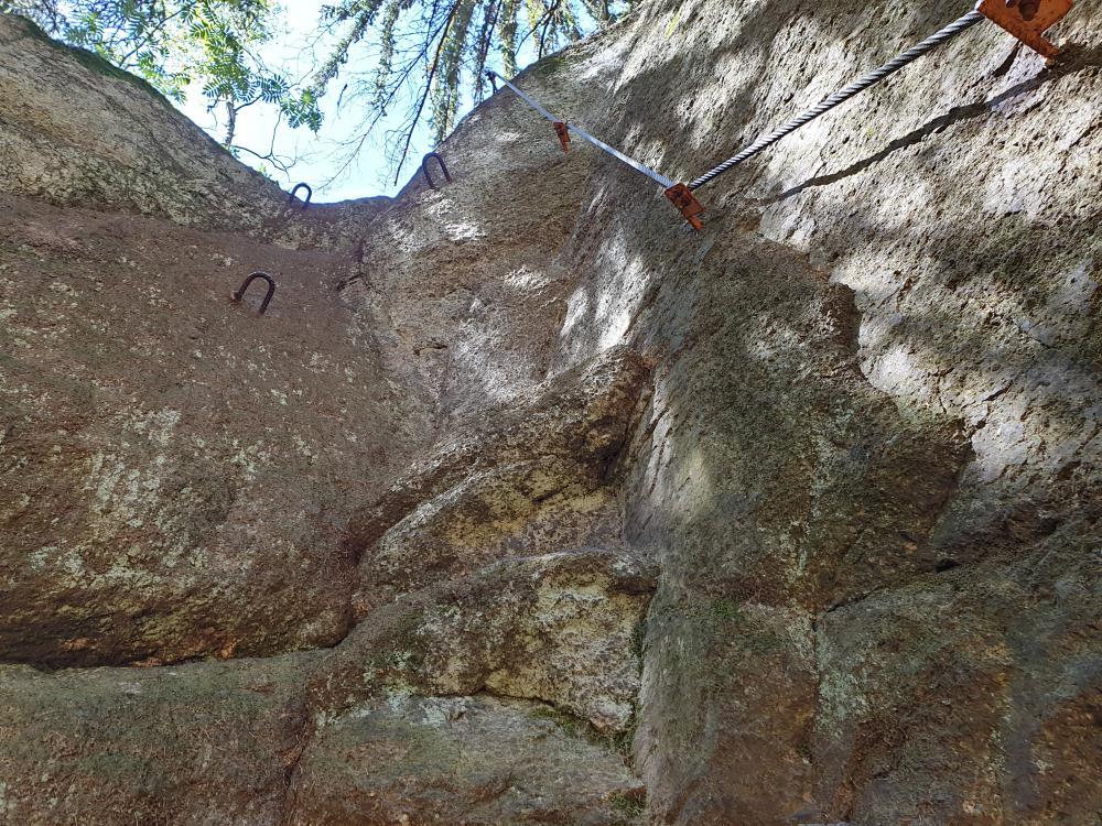 Přístup k ní je jednoduchý. Auto necháte u hlavní silnice, na obecním parkovišti před restaurací, přejdete kolem jejího dvora po můstku přes Rolavu a jste na místě. Skalky jsou skryté na kraji vzrostlého smrkového lesa . Abych pravdu řekl, ač se zde v kraji pohybuji celý život, nikdy dříve jsem si jich nevšimnul. Nečekejte však žádné velké kolmé stěny. Spíše jde o skupinu skalisek a obřích balvanů, stoupajících po strmém úbočí. Pod nimi najdete i jednoduché posezení pro vytvoření zázemí. Prakticky celá ferrata se nachází v lese, což je v rámci ČR docela unikát. Zatímco jinde se hledají cesty s výhledy, tady můžete cestou sbírat houby a přelézat padlé stromy. Je tady několik cest, z nichž nejtěžší varianta D je prakticky jen několikametrový, trochu převislý výběžek. Nevyplácí se ho však podceňoval – i tady si ,zejména za mokra, můžete pěkně nabít hubu. Ferratový set, je tedy samozřejmostí a helma také, i když skála je nádherně kompaktní, bez rizika uvolnění balvanů. Nejzábavnější se asi jeví trasa obtížnosti C , která stoupá napravo a po prvním výšvihu se zanořuje do stínu lesa. Prakticky stále lezete jen několik metrů nad zemí, takže případný pád by určitě nebyl fatální, jako někde v Alpách, ale dá se tu skvěle procvičit technika a výdrž. Další zajímavost přichází při traverzu na vrcholové skalisko. Tady se v jednom místě musíte dokonce protáhnout mezi skálou a kmenem vzrostlého smrku, což prostorově výraznějším osobám, může přivodit úsměvné komplikace. Hned za touto štěrbinou je další místo, kde si zahrajete na visícího opičáka a procvičíte i široce roztažené nohy. Tady jsem musel i přemýšlet, kam stoupnout a jak se otočit. No, dělat to někde nad 100 m propastí bych nechtěl. Pak už je tu mírně převislý traverz a jste u vrcholové knížky.