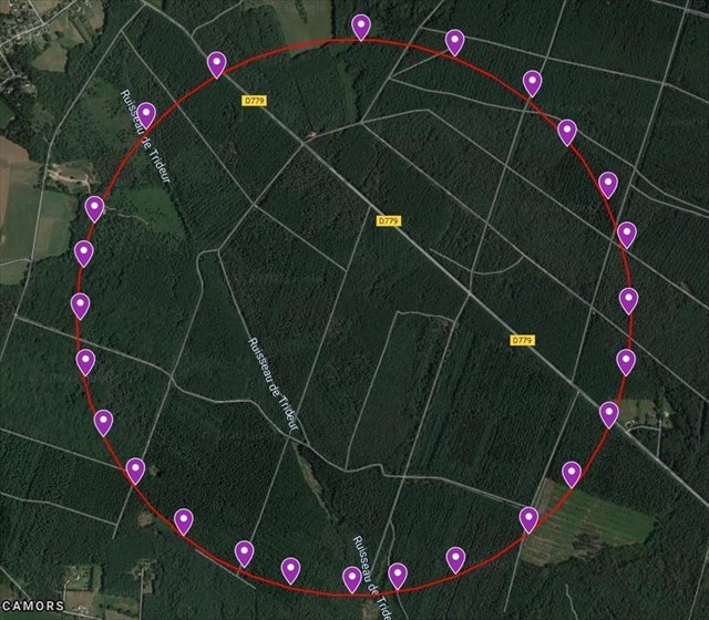 I propose a series of 25 caches which form a circle, plus a bonus cache. This project was born during the "COVID 19" containment in March 2020, when we were allowed to walk 1 km from home. I'm lucky enough to live on the edge of the Floranges forest, but always hiking the same paths after teleworking was boring. So, I had to find other reasons to go to the forest, and why not discover "unexplored" places. At first the idea was to draw a perfect circle with a radius of 1km and to hide the caches at regular intervals, wherever the place was. Eventually I eliminated the really dangerous swamps and private property. (Hence the holes in the circle). As for the notion of "off-track" I eventually often succumbed to the ease of placing caches along the trail but not always