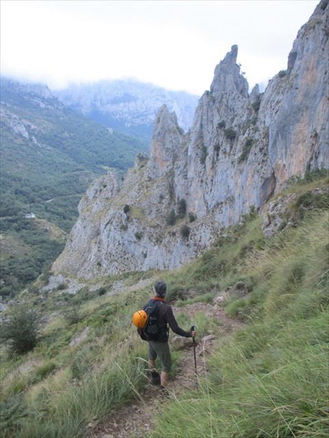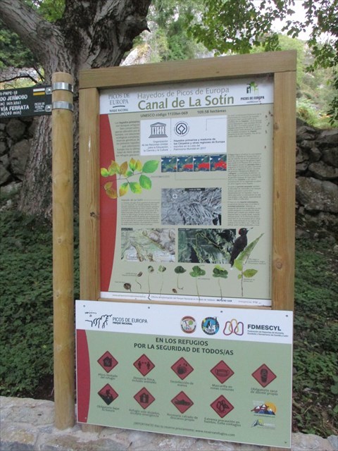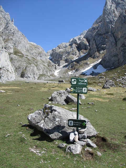 "En Cordiñanes (850m) tomamos hacia NE La Rienda, Senda tallada en roca y con un atrevido trazado que nos lleva a la Canal de La Sotín, perdiéndose de vista el pueblo en el Canto La Rienda y dejando a nuestra izquierda la Pica Castro y a la derecha El Porracho. Pronto nos adentramos por el Paso de Alfredo en el hayedo de La Sotín, que cruzaremos en diagonal -está marcado con hito- y ascenderemos por una zona de tierra roja, que se llama Cuesta Robequera, para llegar a la Vega de La Sotín (1.450m). A esta Vega llegan por su ladera N tres canales: Congosto, Honda y Solano.