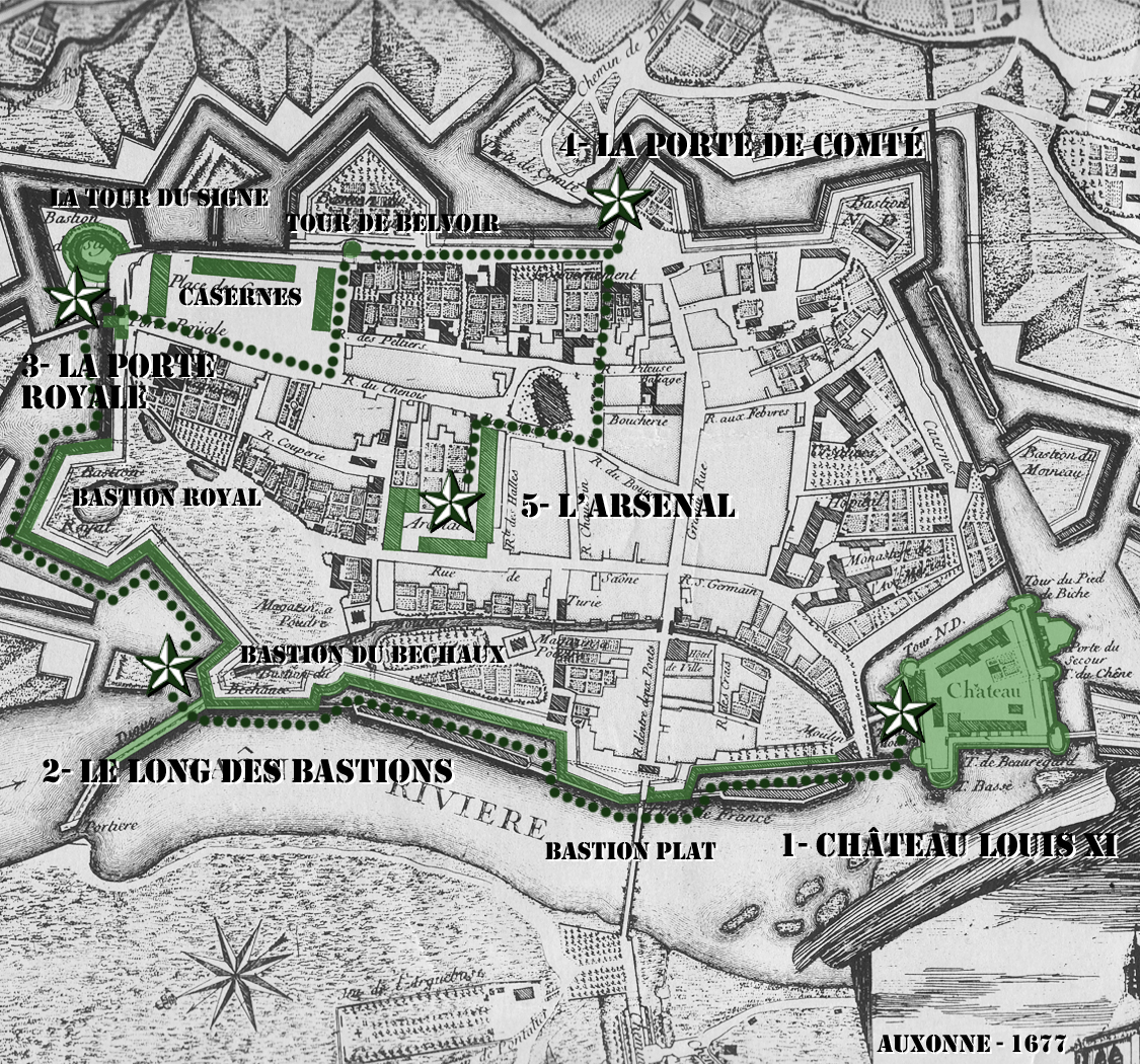 La guerre de Cent ans (1337 à 1453) épargne Auxonne, mais les nécessités de défense contraignent les habitants à remplacer ces antiquités par de solides fortifications que flanquent vingt-trois tours et deux tournelles, dans lesquelles s'ouvrent quatre portes aux quatre points cardinaux.